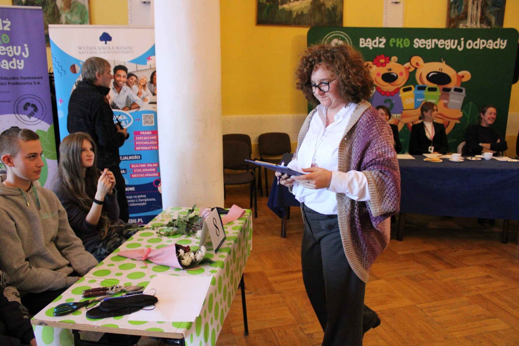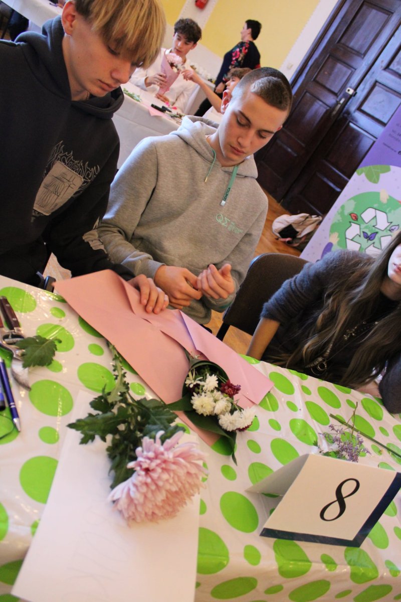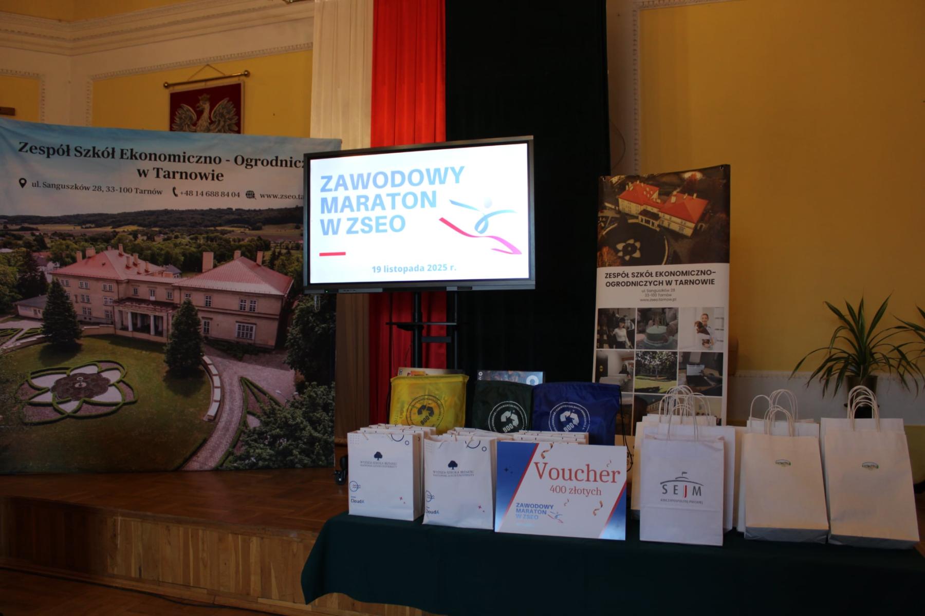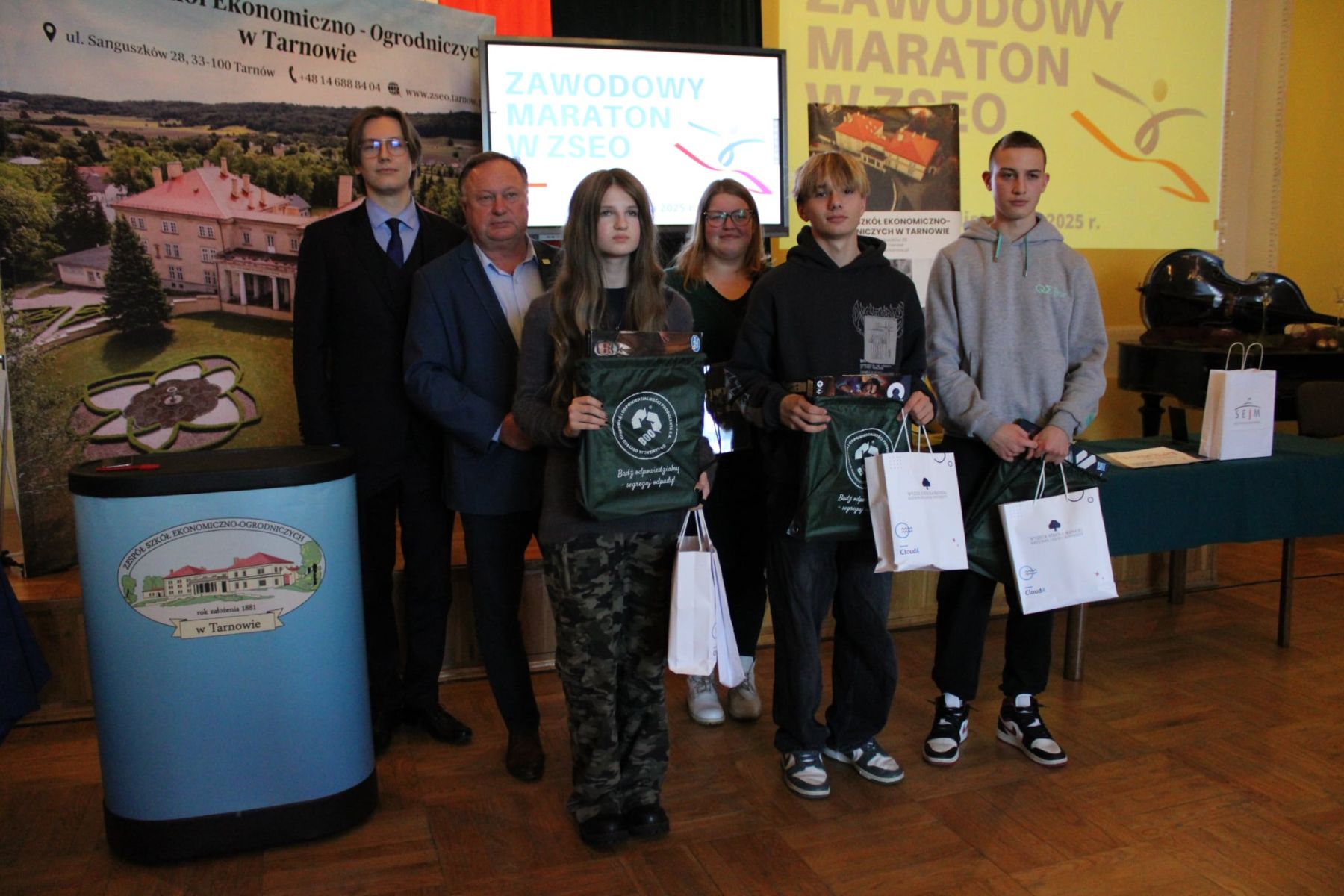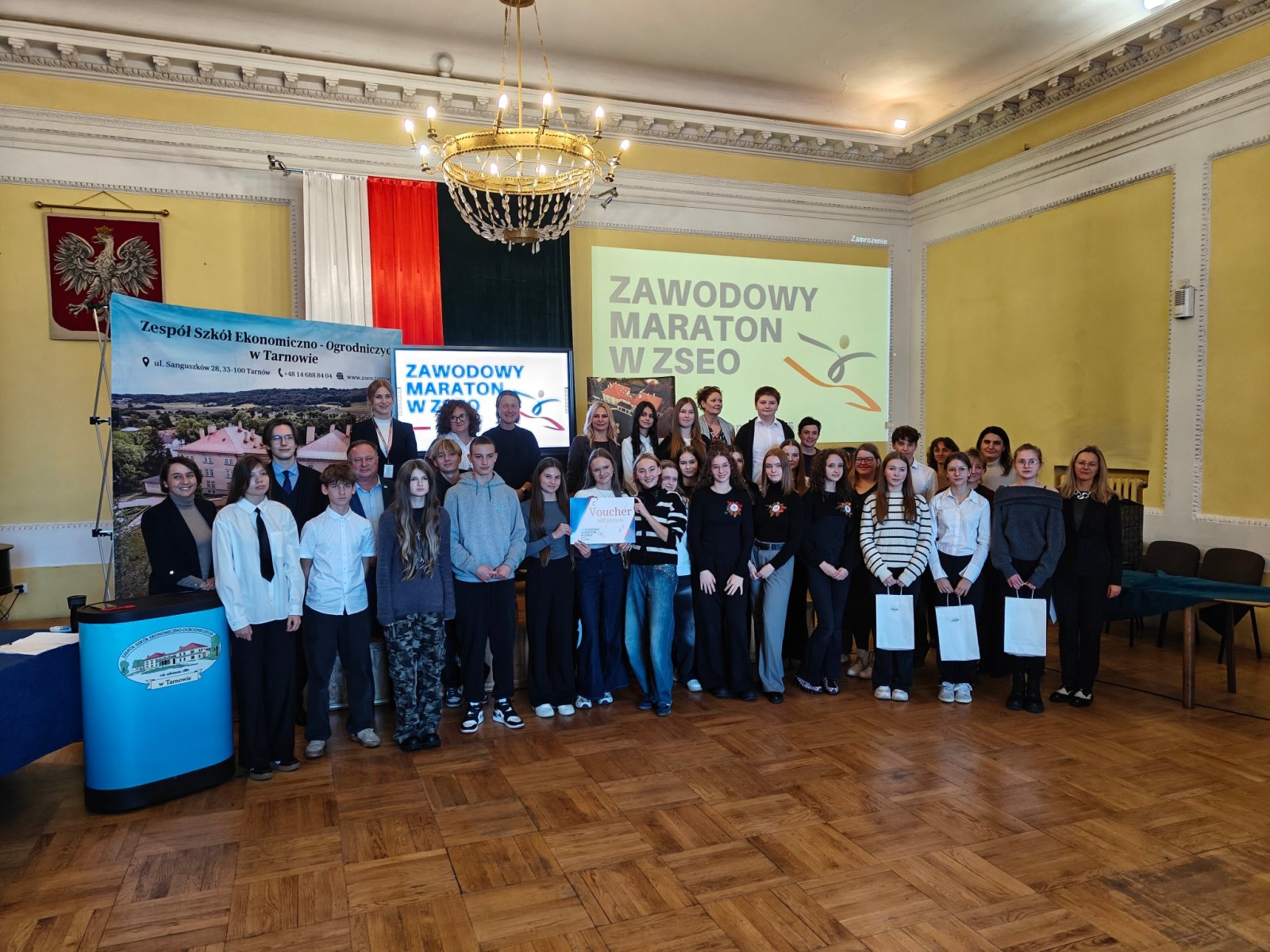 W środę 19 listopada w szkolnej auli Zespole Szkół Ekonomiczno-Ogrodniczych w Tarnowie odbył się Maraton Zawodowy. Młodzież ze szkół podstawowych z Tarnowa i regionu tarnowskiego rywalizowała w pięciu konkurencjach nawiązujących do oferty kształcenia w szkole. Uczestnicy musieli uporać się z zadaniem geograficznym (technik obsługi turystyki), wykonaniem prostej ozdoby kwiatowej (technik architektury krajobrazu), ozdobą wypieku cukierniczego (technik technologii żywności), rozpoznaniem tropów zwierząt domowych i ich organów (technik weterynarii) oraz siodłaniem prowizorycznego konia (technik hodowli koni). Dodatkowo po każdej rundzie drużyny usłyszały jedno pytanie bonusowe z szeroko pojętej ekologii. Każda runda oceniania była przez nauczycieli specjalistów, którzy na co dzień prowadzą zajęcia w ZSEO w Tarnowie. Po emocjonującej rywalizacji drugie miejsce zajął nasz 3-osobowy zespół w składzie: Maria Ligęza, Artur Wąs i Gabriel Iwanek. Gratulujemy i życzymy dalszych sukcesów zawodowych.