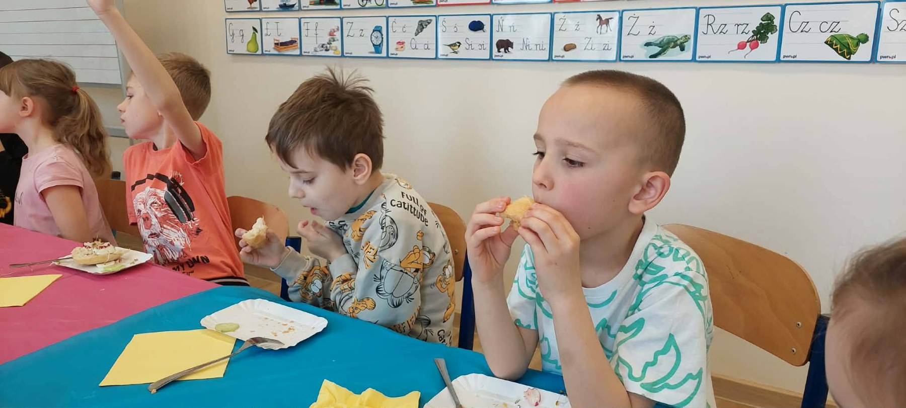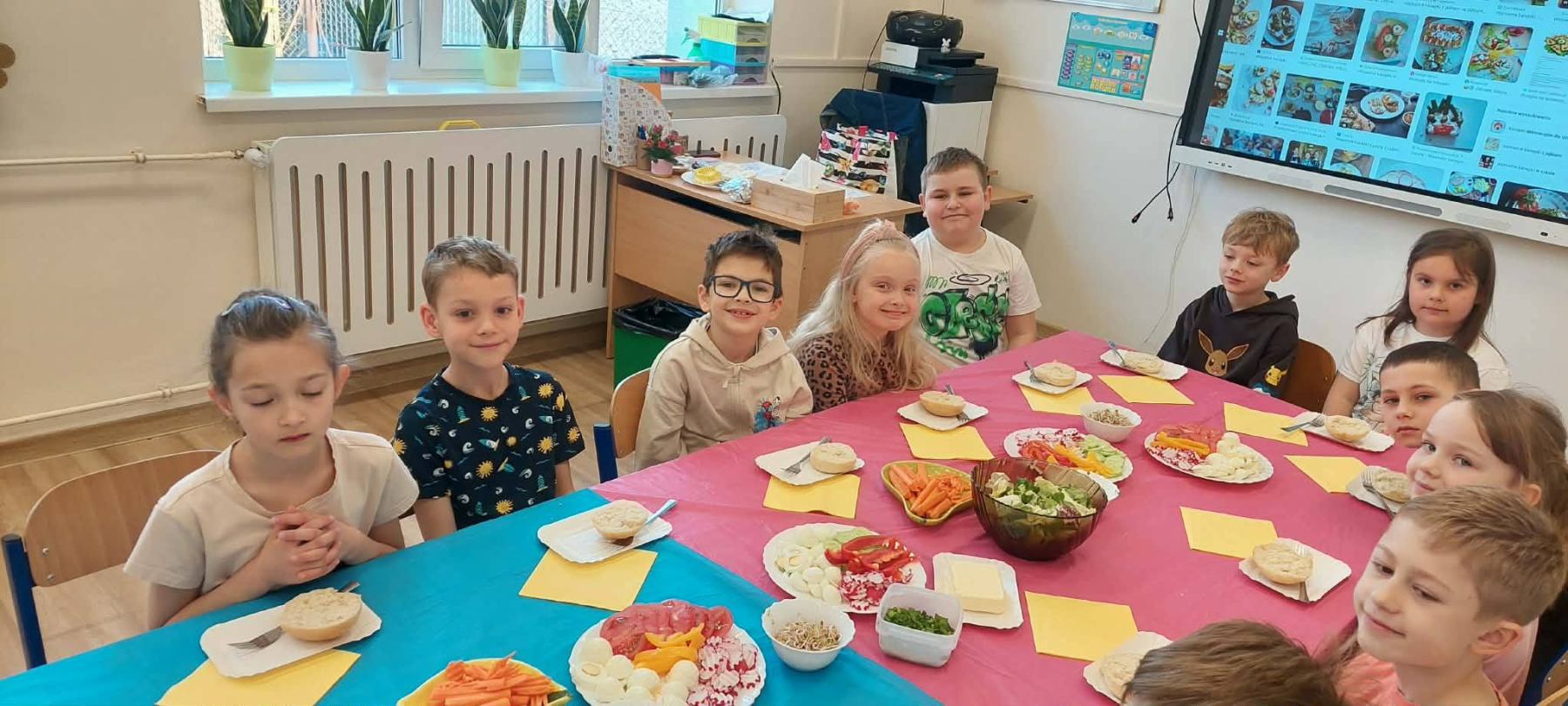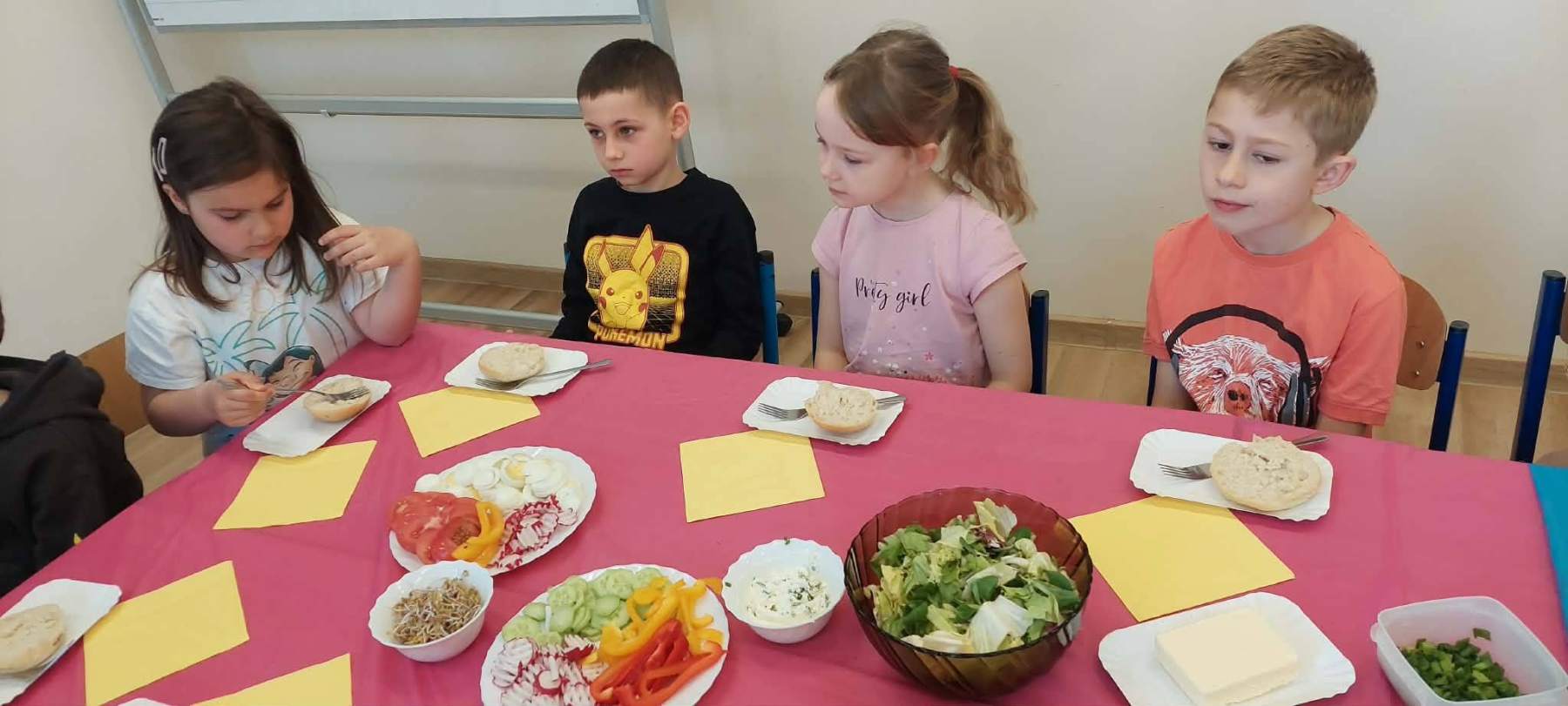 W piątkowy poranek uczniowie klasy I przygotowywali zdrowe, wiosenne i kolorowe śniadanie. Wykorzystali do tego wartościowe produkty, takie jak świeże warzywa, jajka, biały ser oraz wiele innych zdrowych składników. Śniadanie zostało zorganizowane w ramach działań profilaktyki zdrowego odżywiania. Podczas zajęć dzieci dowiedziały się, jak ważne jest właściwe komponowanie posiłków oraz jakie produkty sprzyjają zachowaniu zdrowia, energii i jasności umysłu. Wspólne przygotowywanie posiłku było nie tylko świetną zabawą, ale także cenną lekcją, która z pewnością zaprocentuje w codziennych wyborach żywieniowych uczniów.