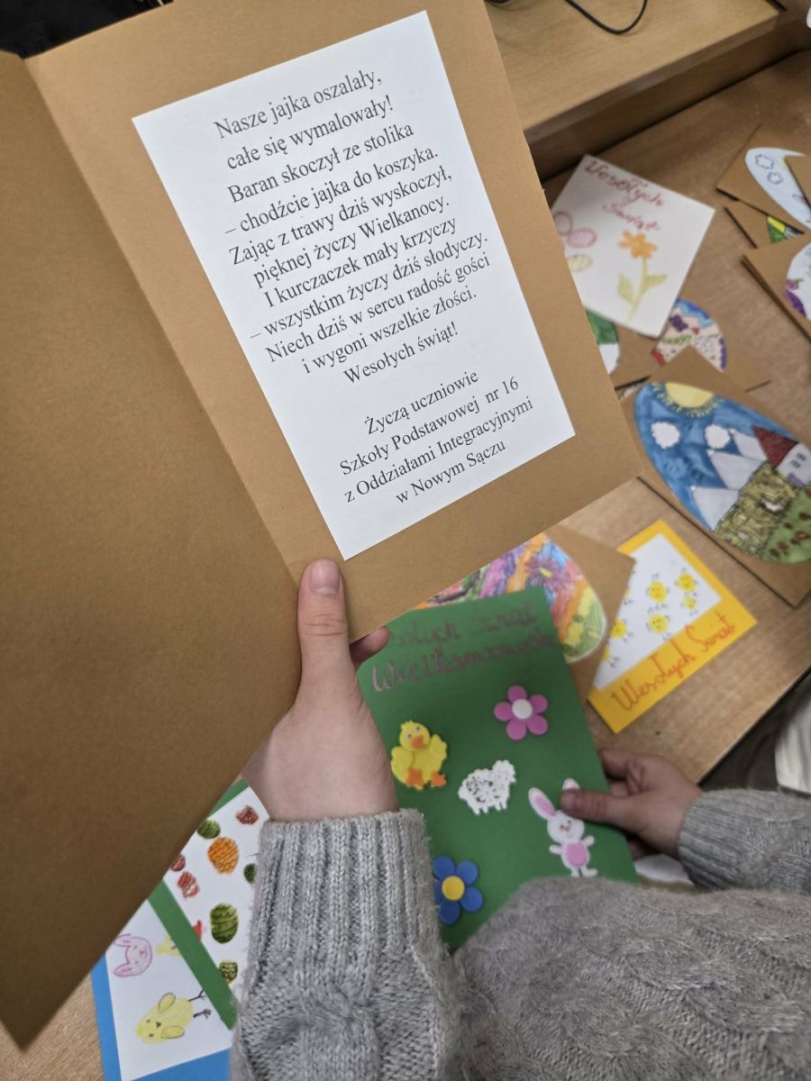 Kolejna międzyszkolna wymiana kartek świątecznych to inicjatywa, która łączy uczniów z różnych Szkół. Dzieci uczęszczające na świetlicę szkolną przygotowały własnoręczne kartki z życzeniami z okazji Wielkanocy. Dzięki temu rozwijają kreatywność, wyrażają życzliwość i kultywują tradycję. Dziękujemy za kartki, które otrzymaliśmy od dzieci ze Szkoły Podstawowej nr 16 z Oddziałami Integracyjnymi w Nowym Sączu.