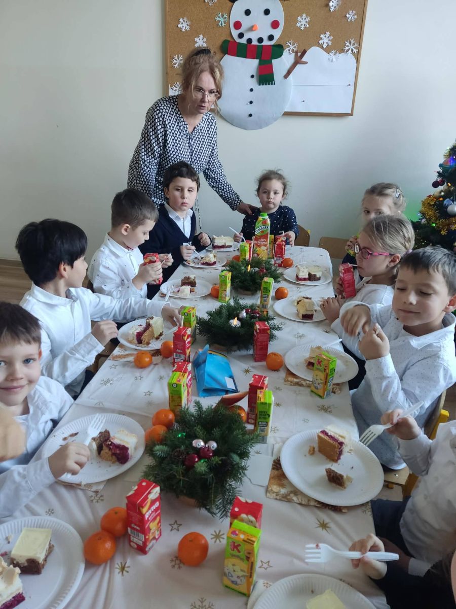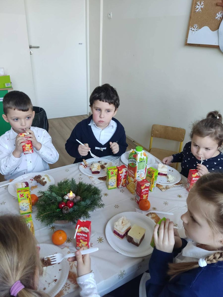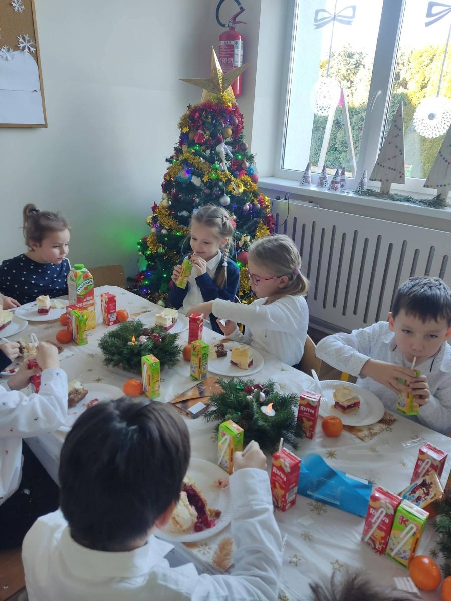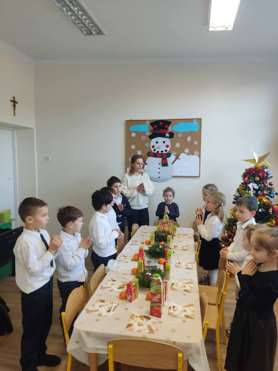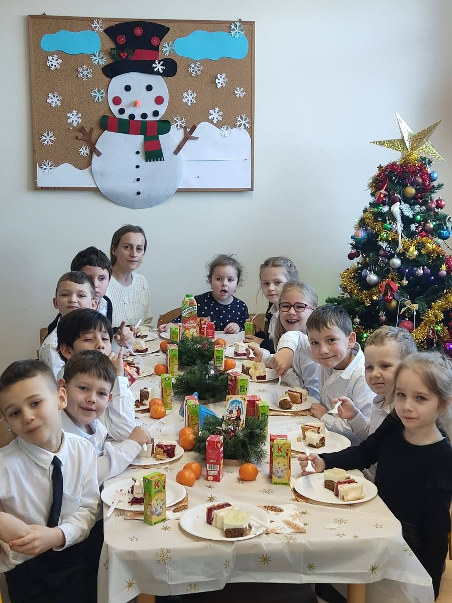 Dziś dzieci z oddziału przedszkolnego spotkały się przy wigilijnym, pięknie przystrojonym stole. Po wspólnej modlitwie i łamaniu się opłatkiem oraz życzeniach świątecznych składanych sobie nawzajem przystąpiliśmy do zjedzenia pysznych ciast. Przy dźwiękach kolęd i wspólnych rozmowach przy wigilijnym stole szybko minął nam czas. W tym świątecznym dniu nie zabrakło też wspólnych zdjęć przy wigilijnym stole i klasowej choince oraz ciekawych zajęć związanych z przygotowaniami do Świąt Bożego Narodzenia.