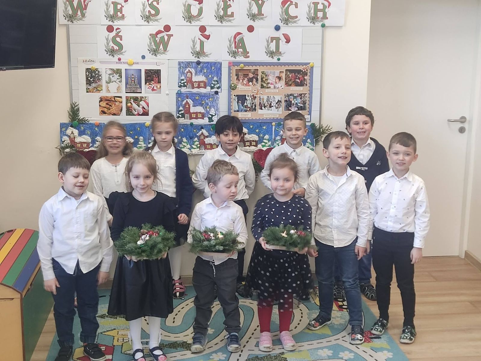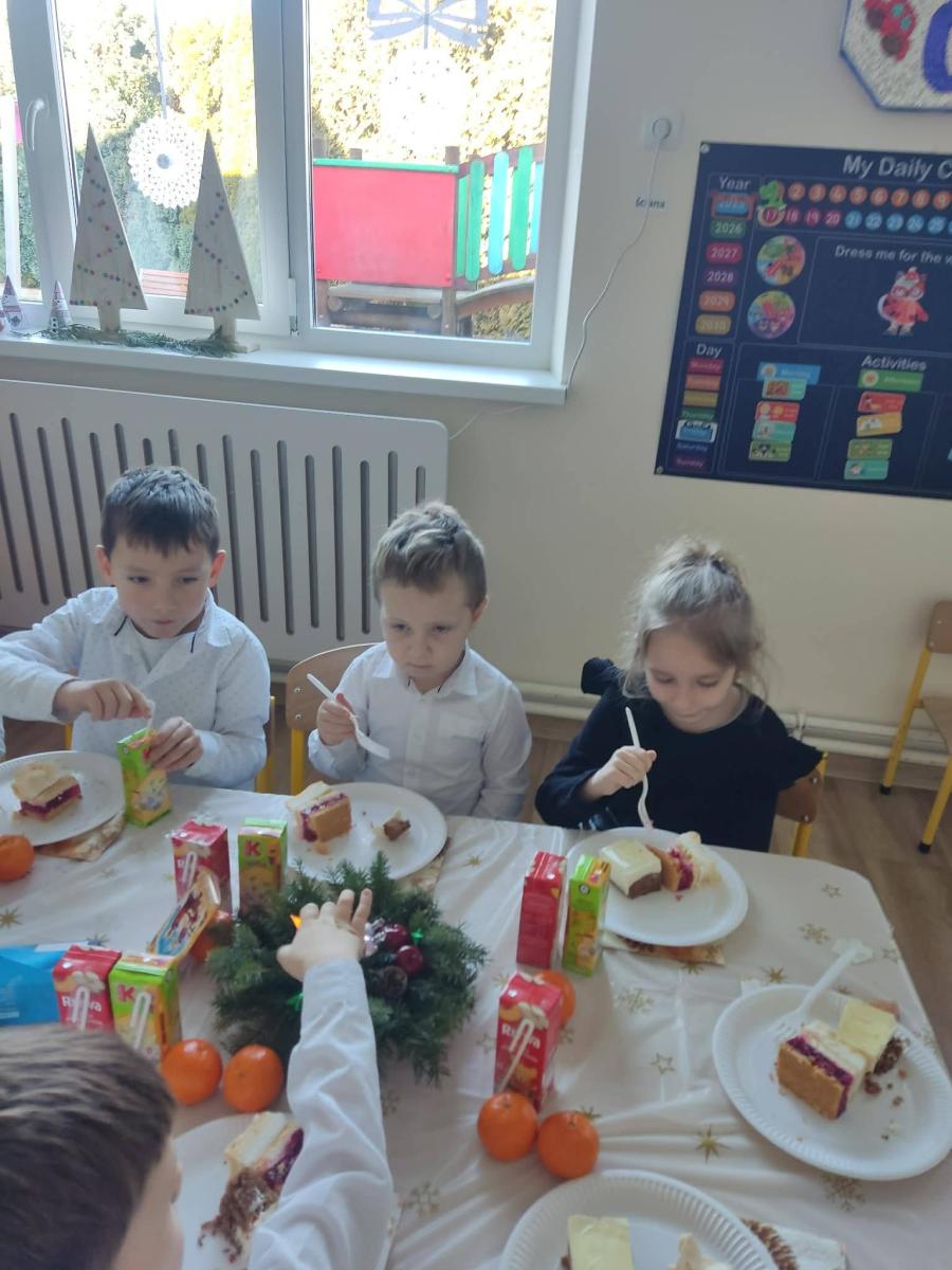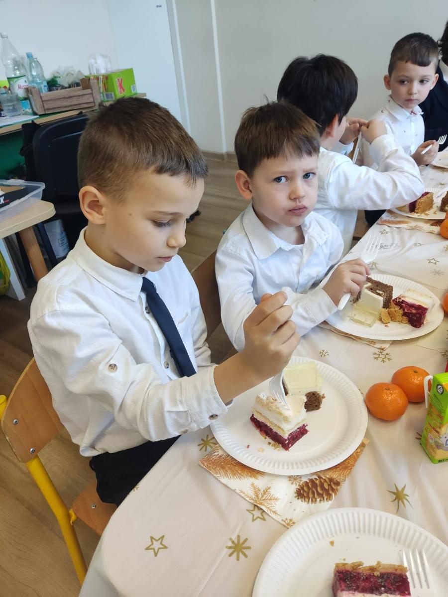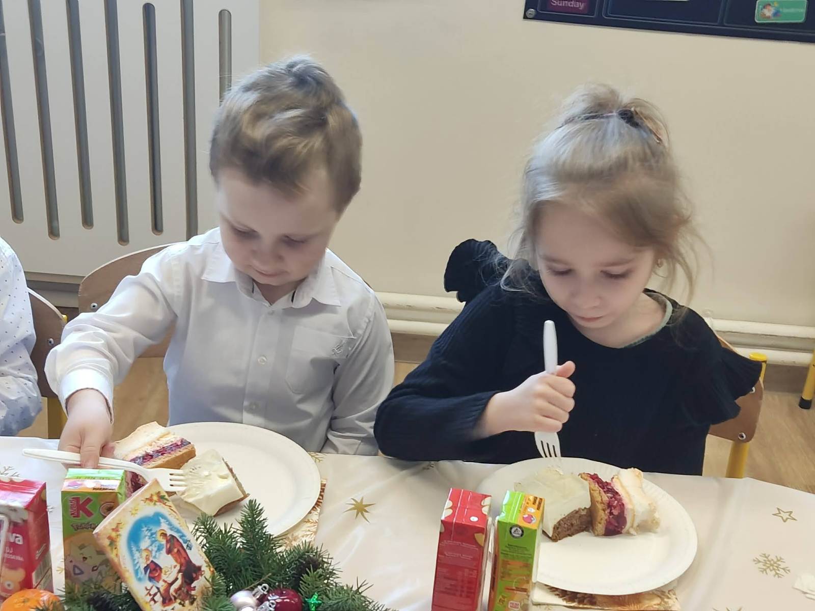 Dziś dzieci z oddziału przedszkolnego spotkały się przy wigilijnym, pięknie przystrojonym stole. Po wspólnej modlitwie i łamaniu się opłatkiem oraz życzeniach świątecznych składanych sobie nawzajem przystąpiliśmy do zjedzenia pysznych ciast. Przy dźwiękach kolęd i wspólnych rozmowach przy wigilijnym stole szybko minął nam czas. W tym świątecznym dniu nie zabrakło też wspólnych zdjęć przy wigilijnym stole i klasowej choince oraz ciekawych zajęć związanych z przygotowaniami do Świąt Bożego Narodzenia.