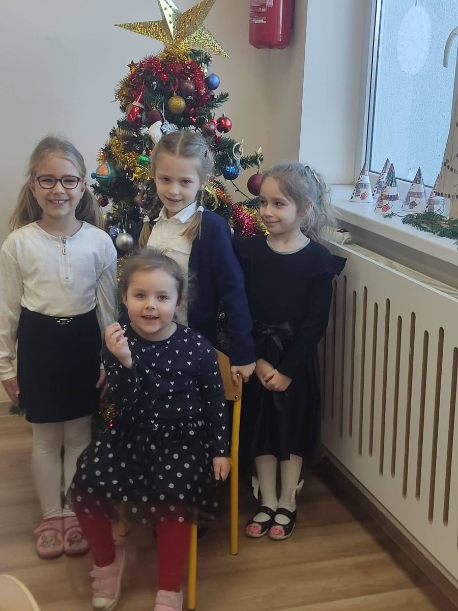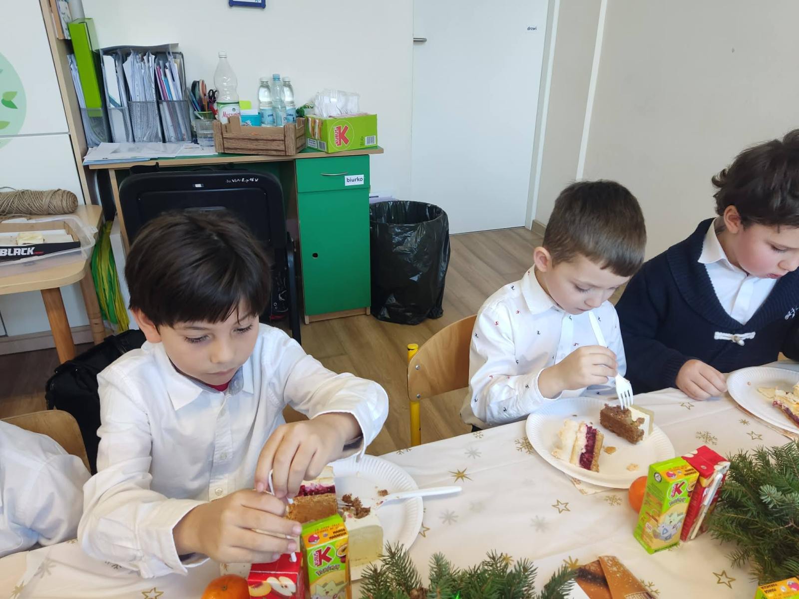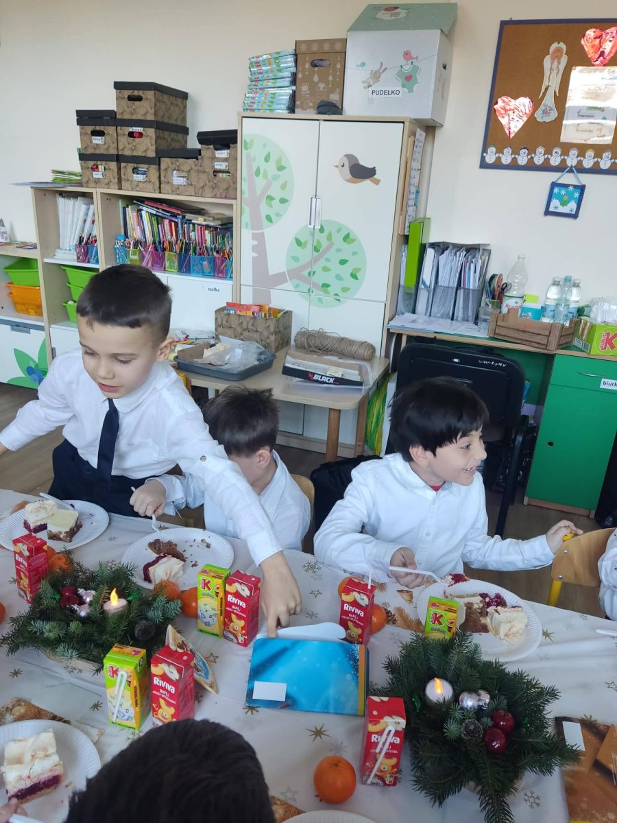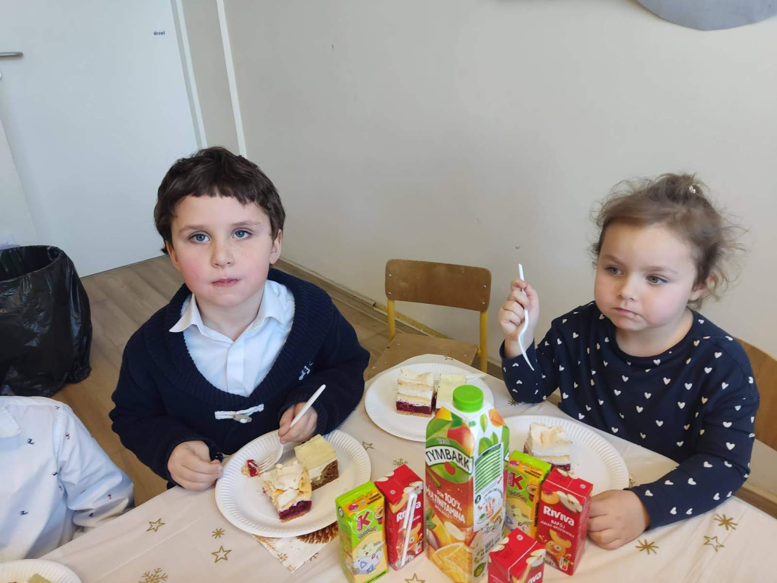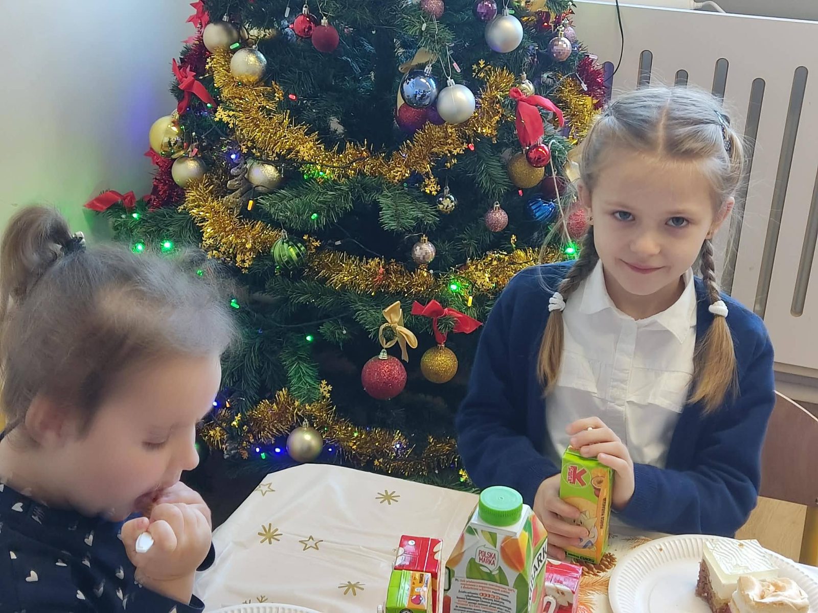 Dziś dzieci z oddziału przedszkolnego spotkały się przy wigilijnym, pięknie przystrojonym stole. Po wspólnej modlitwie i łamaniu się opłatkiem oraz życzeniach świątecznych składanych sobie nawzajem przystąpiliśmy do zjedzenia pysznych ciast. Przy dźwiękach kolęd i wspólnych rozmowach przy wigilijnym stole szybko minął nam czas. W tym świątecznym dniu nie zabrakło też wspólnych zdjęć przy wigilijnym stole i klasowej choince oraz ciekawych zajęć związanych z przygotowaniami do Świąt Bożego Narodzenia.