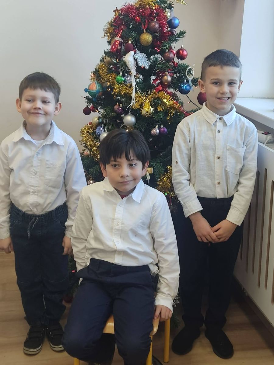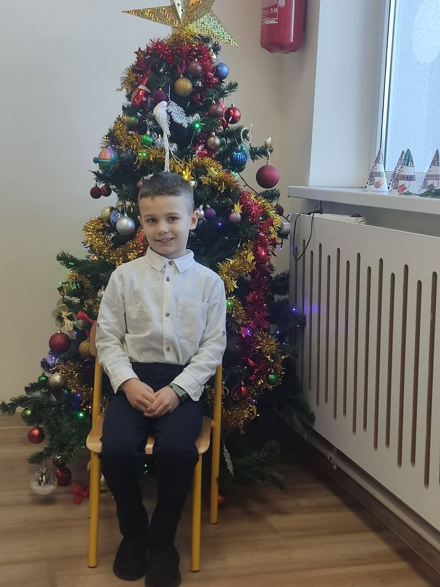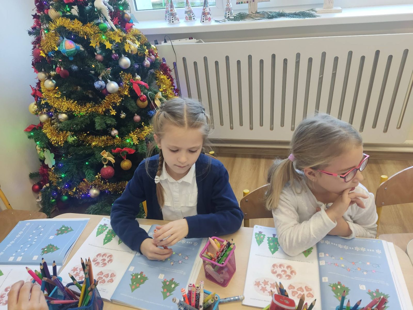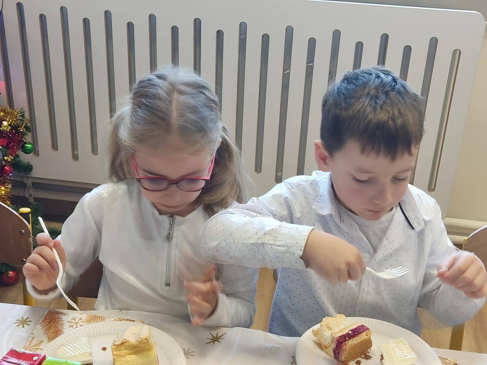 Dziś dzieci z oddziału przedszkolnego spotkały się przy wigilijnym, pięknie przystrojonym stole. Po wspólnej modlitwie i łamaniu się opłatkiem oraz życzeniach świątecznych składanych sobie nawzajem przystąpiliśmy do zjedzenia pysznych ciast. Przy dźwiękach kolęd i wspólnych rozmowach przy wigilijnym stole szybko minął nam czas. W tym świątecznym dniu nie zabrakło też wspólnych zdjęć przy wigilijnym stole i klasowej choince oraz ciekawych zajęć związanych z przygotowaniami do Świąt Bożego Narodzenia.